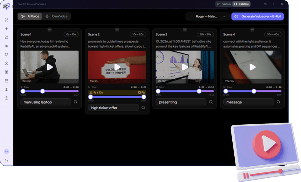 Not everyone wants to appear on camera. ReviewSuite 360 solves this problem with built-in video filters and done-for-you B-roll content, allowing you to create faceless review videos.