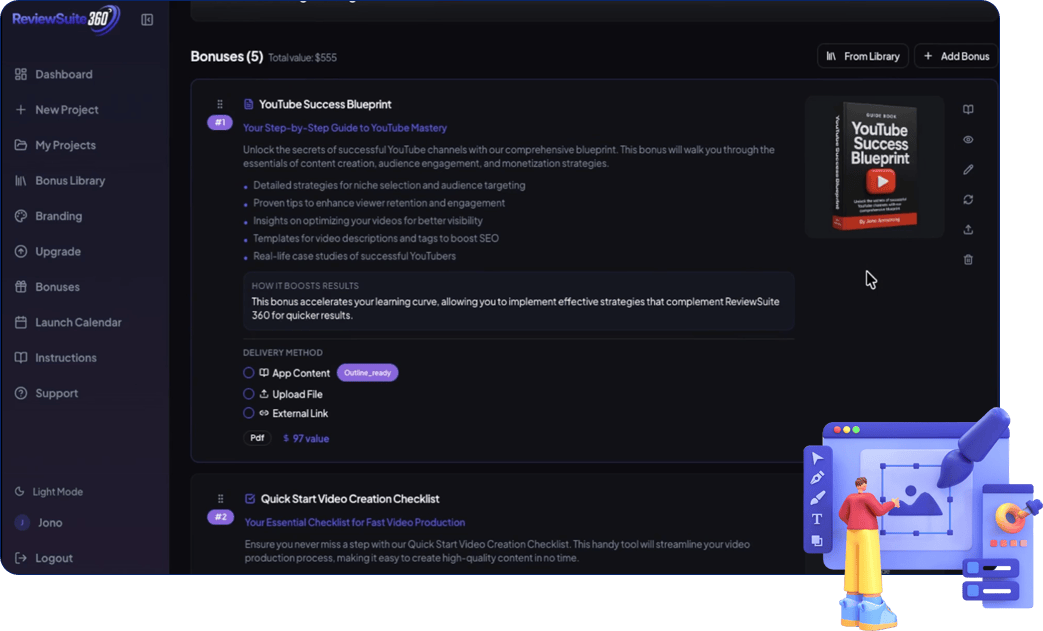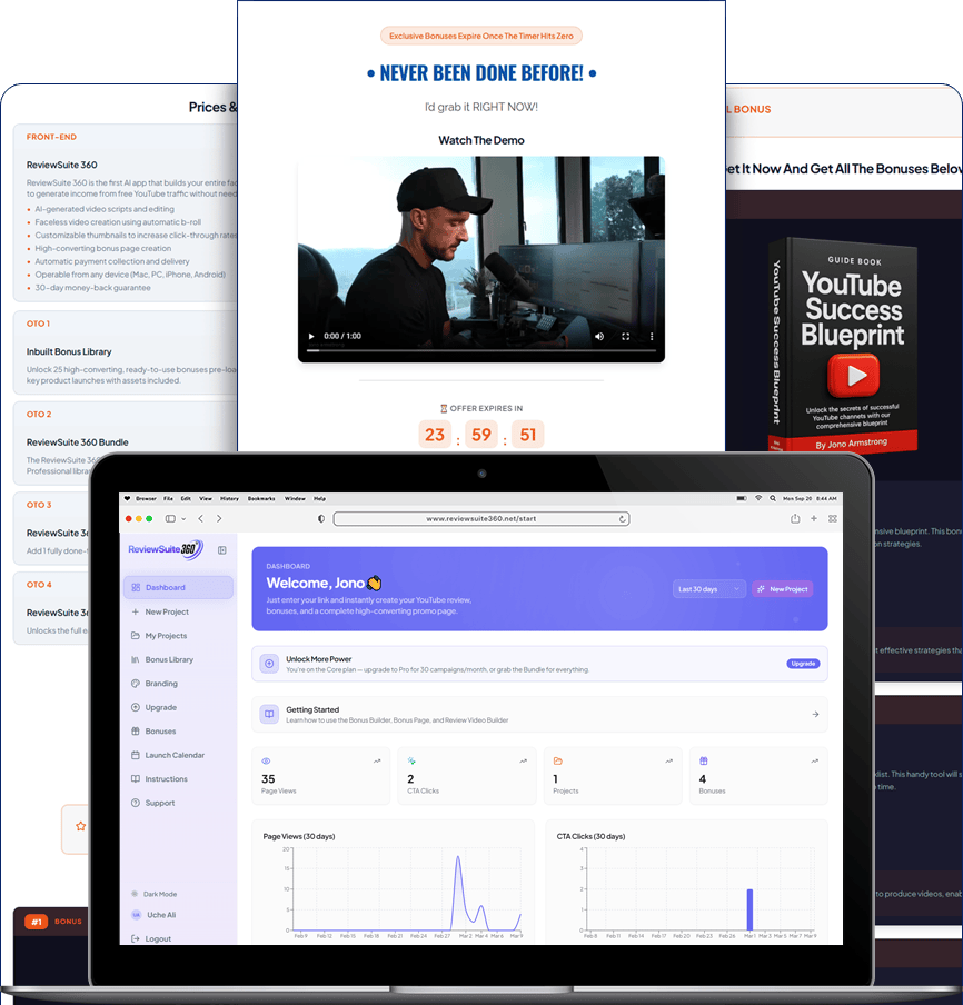 Instead of juggling multiple tools and platforms, ReviewSuite 360 brings everything into a single dashboard, including video creation, script writing, bonus creation, and campaign management.